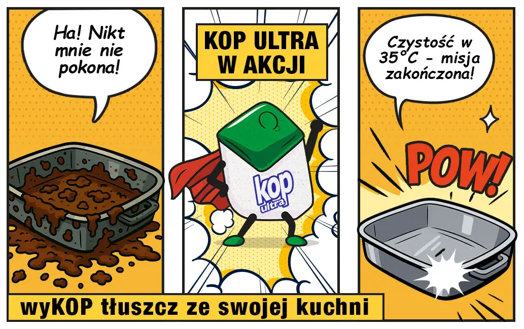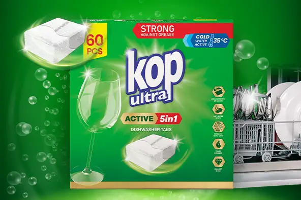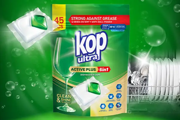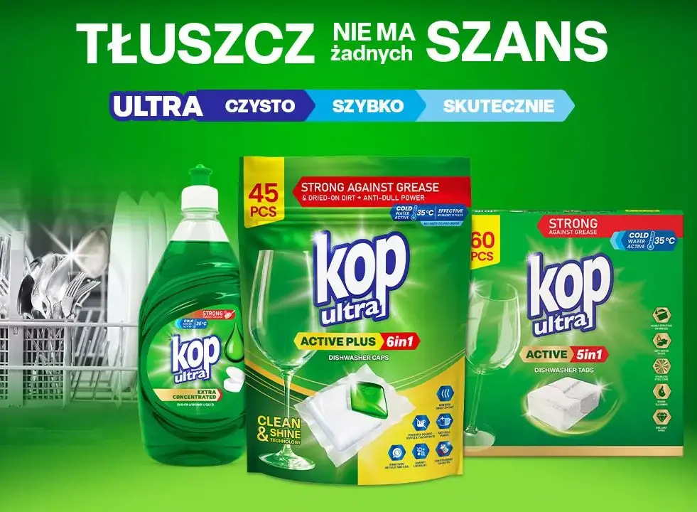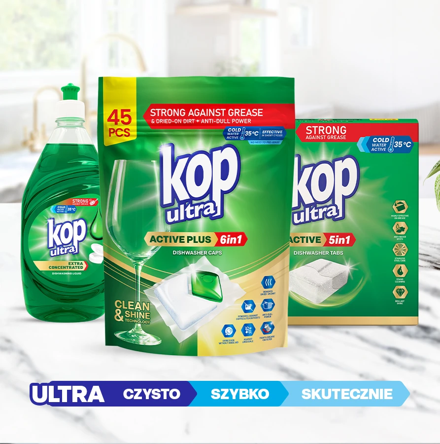 KOP ultra to sprawdzona skuteczność w nowoczesnej odsłonie. Produkty stworzone do codziennego zmywania, które działa szybko, skutecznie i bez kompromisów. Czyste naczynia, mniej wysiłku, realna oszczędność. Ultra czysto, ultra szybko i ultra skutecznie.